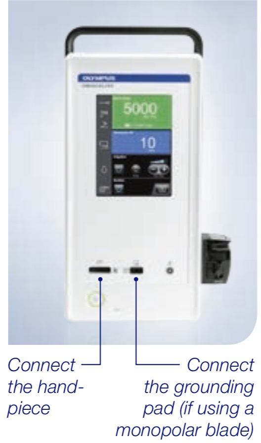 5 Connect accessories: Connect the handpiece. Connect the grounding pad (if using a monopolar blade). Connect the foot switch (red dot to red dot).