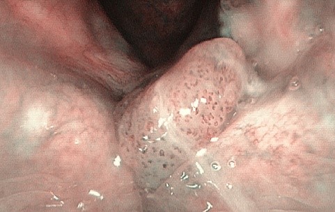 NBI demonstrate proliferative growth near anterior commissure and supracommissural area with well defined brownish dots indicative of squamous cell carcinoma. Advanced meandering and dilated end capillaries, few dot like vessel loops.