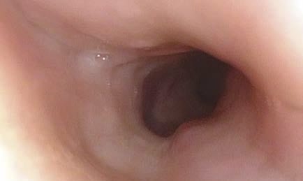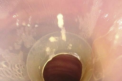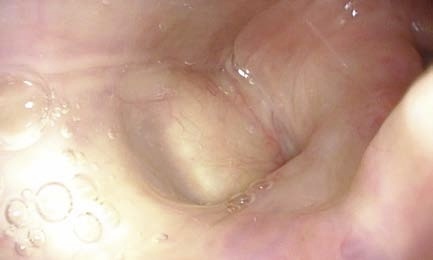 → During swallowing, guide the endoscope above the esophageal opening / the postcricoid region. The upper esophageal sphincter “catches” the endoscope and pulls it inwards, thus it is pulled into the esophagus. You will suddenly see a lumen filled with bubbly fluids. - “Breathe again and do not swallow”