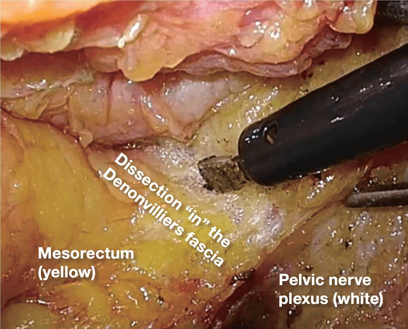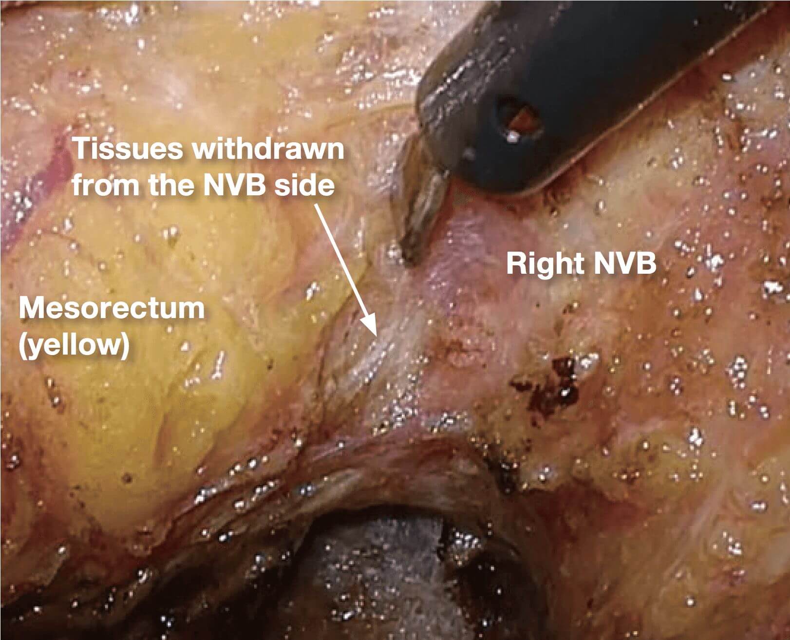 La fascia endopélvica que cubre el músculo elevador del ano es incidida y se reseca con mesorrecto. Esto hace posible asegurar un margen de resección circunferencial e identificar fácilmente el límite entre el mesorrecto y el paquete neurovascular.