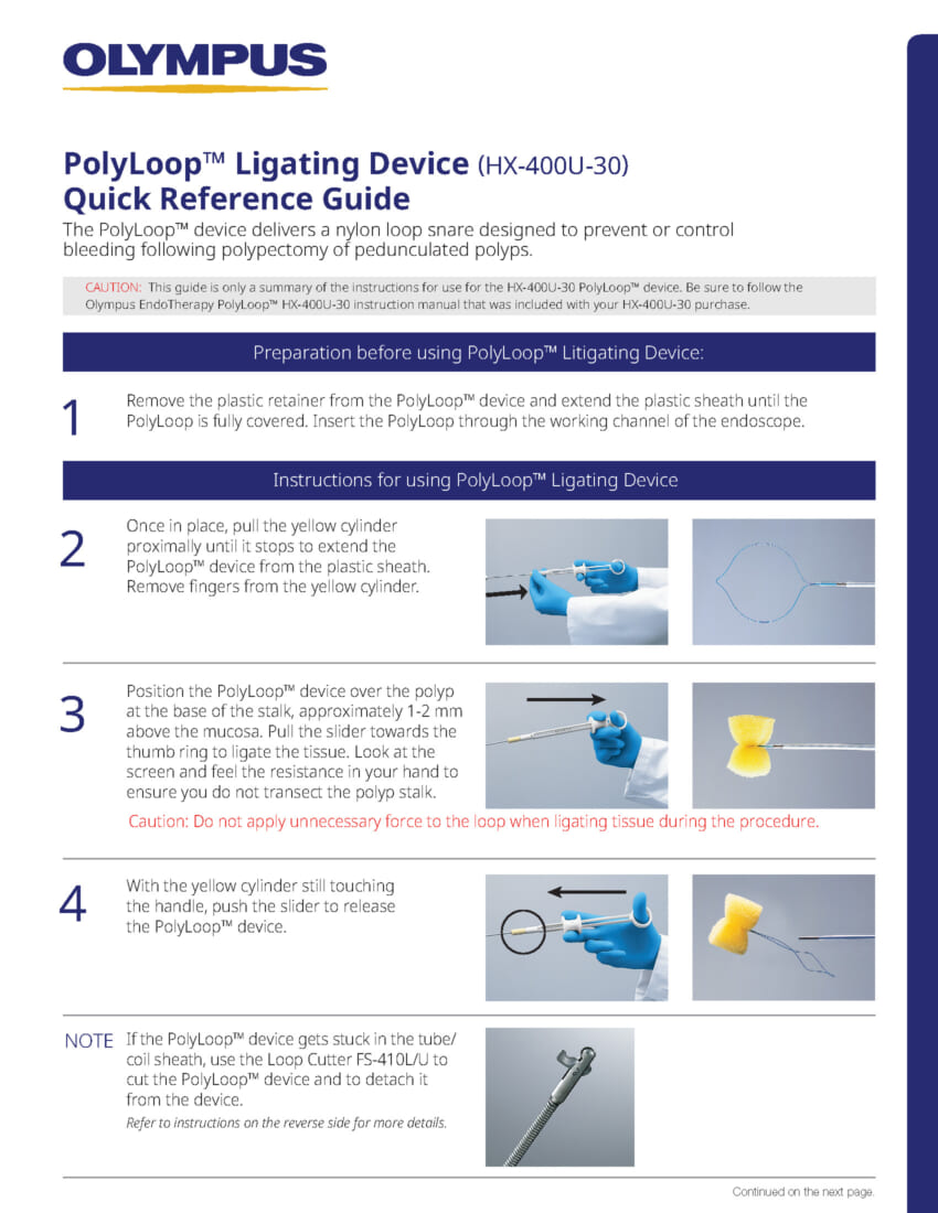 CAUTION: This guide is only a summary of the instructions for use for the HX-400U-30 PolyLoop™ device. Be sure to follow the Olympus EndoTherapy PolyLoop™ HX-400U-30 instruction manual that was included with your HX-400U-30 purchase.