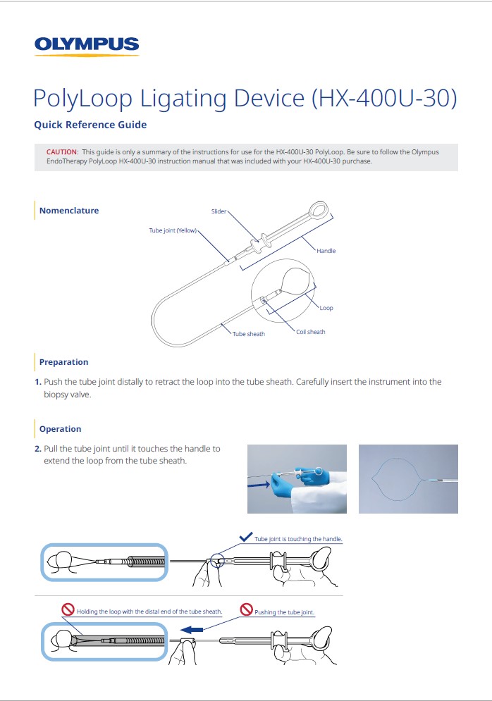 CAUTION: This guide is only a summary of the instructions for use for the HX-400U-30 PolyLoop. Be sure to follow the Olympus EndoTherapy PolyLoop HX-400U-30 instruction manual that was included with your HX-400U-30 purchase.