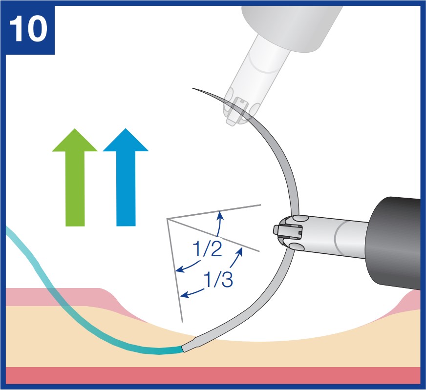 The assistant twists the needle-holder until the needle point is pointing parallel to the tissue surface. This helps control suture depth.