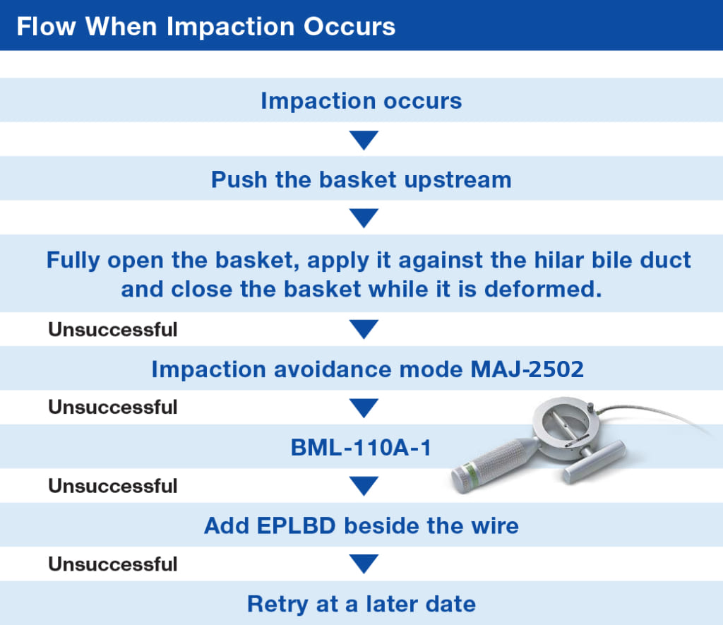 We believe that this device is effective for small stones in general. It is particularly effective in cases where a pocket has formed at the lower end of the bile duct.