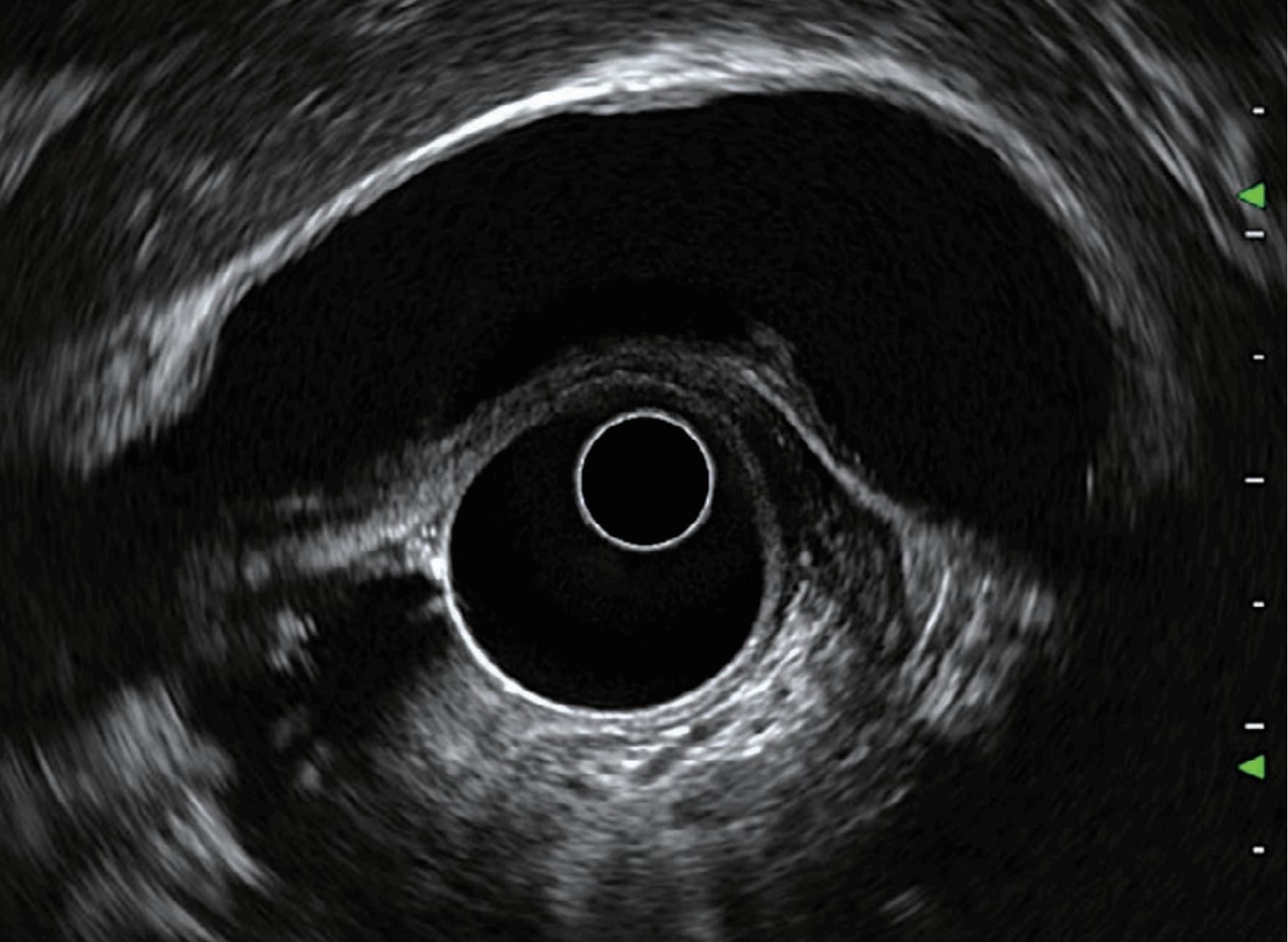 A 43-year-old female patient has hypertension and autoimmune disease. She was diagnosed in 2013 with a gastric leiomyoma < 1 cm. EUS was performed again as part of a surveillance program. THE was used to view the gastrointestinal layers with less artifacts and more contrast. A 9.3 mm x10.4 mm homogenously hypoechoic ovoid lesion with discrete borders was seen from the mucosa to the muscularis propria.