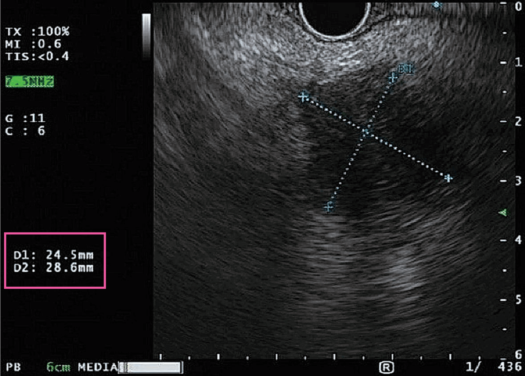 The B/A ratio was measured to be 153.67 which is suggestive of malignancy. To ascertain malignancy, EUS-FNA was performed. 3 passes were done and specimens were sent for cytology. These specimens tested positive for malignant adenocarcinoma.