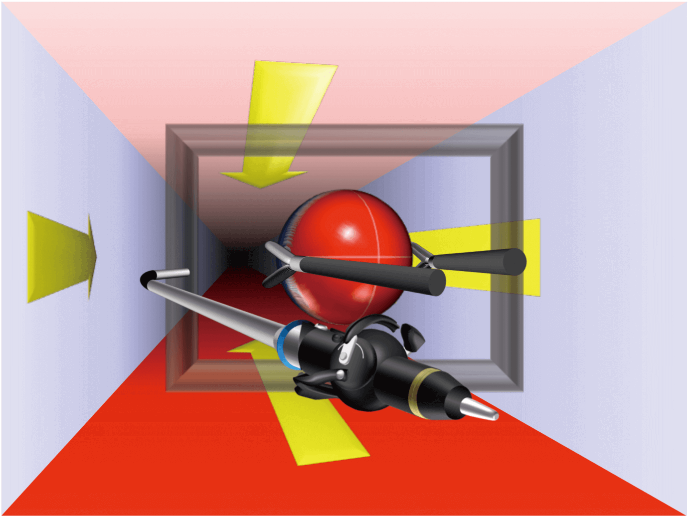 When the image is captured right in front of the object, that is, when the observing point is set on the horizontal plane passing through the center of the sphere and two pairs of hand instrumentsare inserted from the right and left sides on the same plane, the hand instruments appear to be horizontally inserted from both sides. As to the spatial relation, the near side corresponds to the external sides of the screen, and the far side to the center of the screen. A detailed explanation is given according to the laws of perspective. Here, the depth of the screen is unconsciously visualized as a space with a vanishing point (infinity) at the center of the screen.