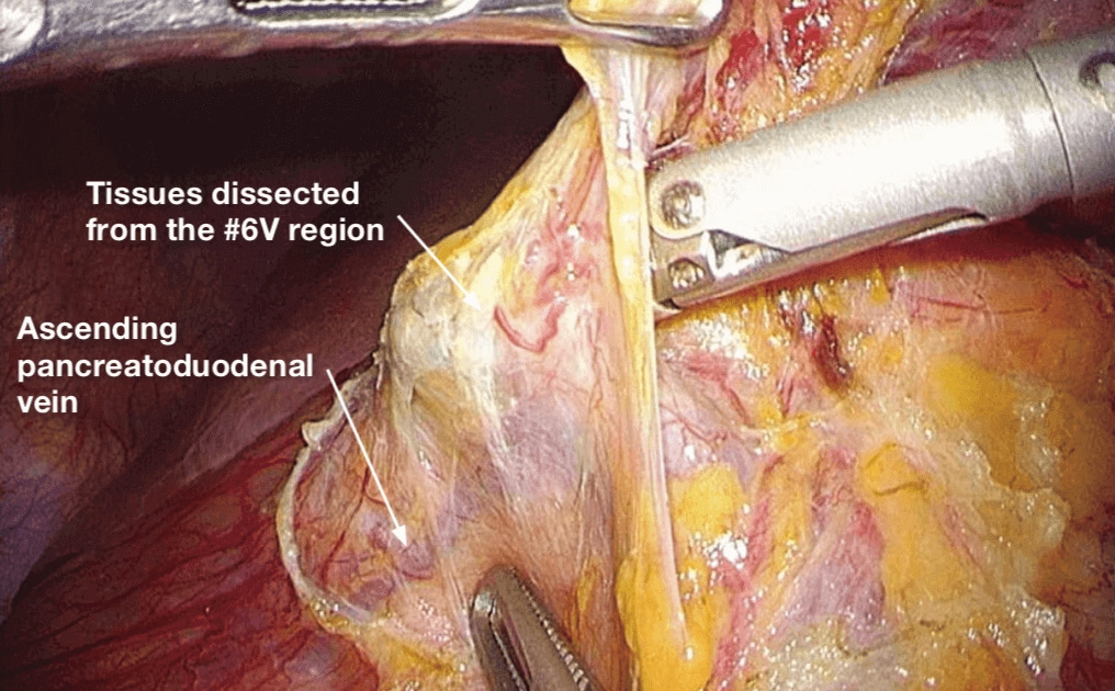 The dissected tissues, which have already been lifted with the tissue layer overlying the anterior surface of the pancreas (#6V region), are cut along the ascending pancreaticoduodenal vein in the direction of the duodenum.