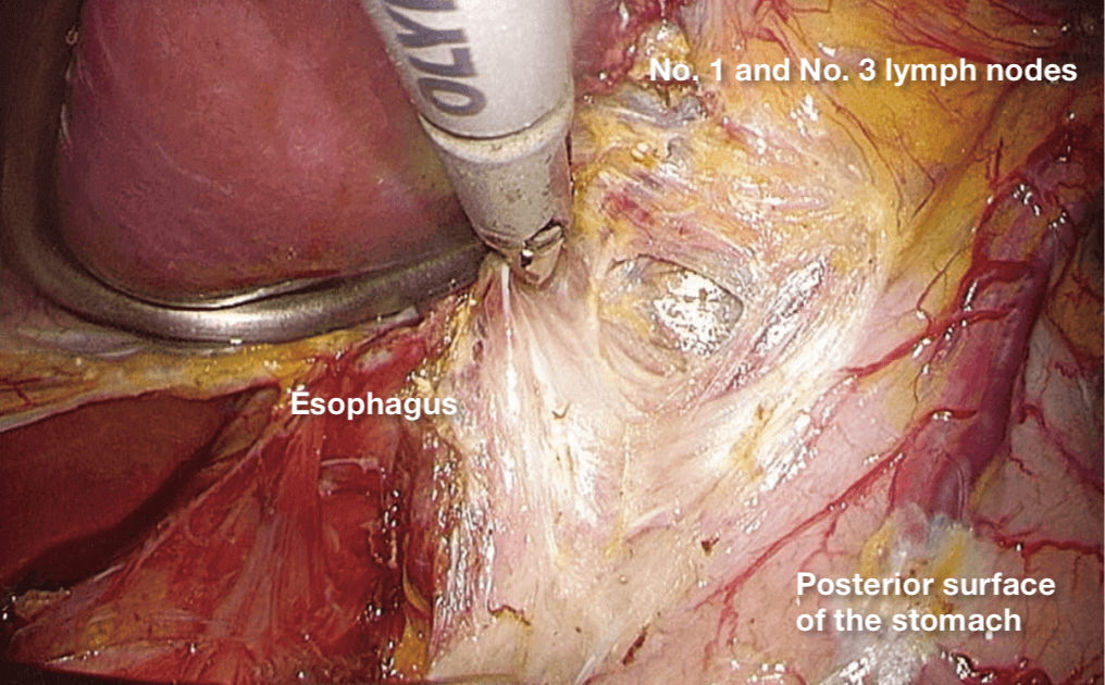 Thereafter, dissection of the retroperitoneum is advanced along the right diaphragmatic crura, and the No. 1 lymph nodes are dissected to the upper limit rostrally.