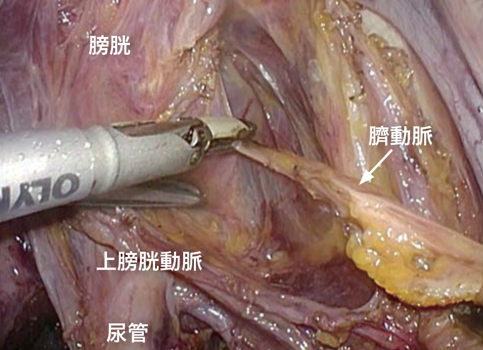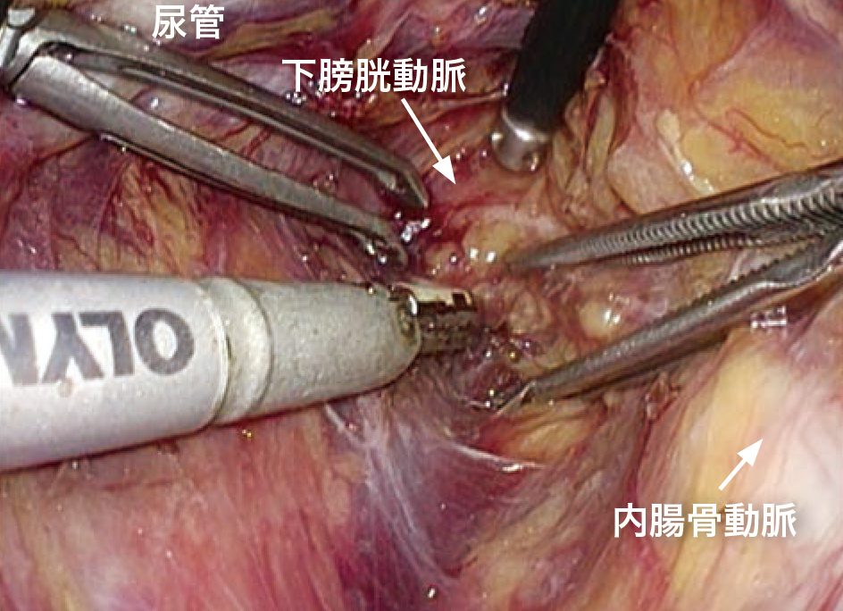 症例:69才/女性【ポートと術者位置】 【側方転移リンパ節画像】 1 尿管をテーピング、左下ポート創を通して牽引する。 2 尿管・下腹神経を包む結合組織“膜”の内側面に沿って剥離を進める。 3 2の剥離を肛門側へ可及的に進む。この症例では挙筋まで到達できず。 4 外側の剥離に移る。外腸骨動静脈に沿った剥離をさらに骨盤壁に沿うように進める。遭遇する血管は温存、後に閉鎖動脈であることが分かる。 5 内外腸骨静脈の又で閉鎖神経が確認できる。 6 臍動脈の外側面に沿って剥離を進める。 7 臍動脈の外側面に沿って骨盤底へと剥離、外側に閉鎖神経を確認できる。 8 剥離が骨盤底に達し、骨盤壁に沿って剥離した空間と連絡する。 9 8の操作で到達した骨盤底を俯瞰する 10 臍動脈と上膀胱動脈の間を広く展開し、膀胱壁に沿って結合組織を切離する。9の*で示した面の内側面(*)である。 11 10の破線(膀胱壁)に沿って切離、鈍的に剥離する。 12 臍動脈の遠位部をTHUNDERBEATで切断する。 13 臍動脈を切断した後、9・10の*の面を膀胱壁に沿って骨盤底に向けて切離する。 14 閉鎖孔周囲の郭清を示す。 15 切離している結合組織の下に腰神経叢が見える。 16 転移リンパ節はガーゼの下、腰神経叢を覆う結合組織を切離しなくても、リンパ節を含む脂肪組織は郭清されている。*は腰神経を覆う結合組織の連続。 17 図16の*で示す結合組織を切離すると下臀動脈が見える。この動脈周囲脂肪は大坐骨孔へ続く脂肪で郭清領域ではない。つまり*で示す結合組織を温存し、その背側に入る必要はない。 18 内陰部動脈を温存しつつリンパ節を剥離した。 19 神経血管束の外側面を視認しながら脂肪組織を切離する。 20 内腸骨動脈・静脈の内側面の底部の郭清が不十分に思われる。 21 下膀胱動脈周囲をcleanにするには血管を合併切除した方がよいのかもしれない。白丸の脂肪組織は摘出し血管は温存した。仙骨神経・骨盤神経叢を覆う結合組織が破れ肛門挙筋が垣間見える。 22 最終光景① 23 最終光景② 24 最終光景③ 大網・横行結腸間膜切離 おわりに