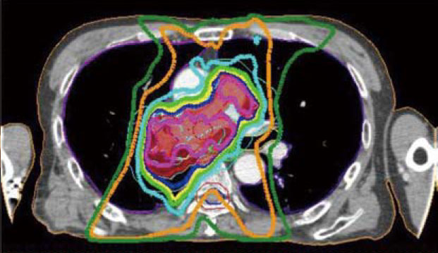 II期以上の非小細胞肺癌に対しても、強度変調放射線治療を取り入れることで、一定の治療成果が得られており、今後は適応範囲になっていくと考えられる。強度変調放射線治療は、病巣の形状に合わせて放射線を照射することができるため、正常組織への影響を最小限にしながら、従来よりも多くの放射線を腫瘍に照射することができる。同様に中枢部の肺癌に対しても、照射範囲を限定して食道や主気管支に対する放射線障害を軽減することが可能になってきており、適応の拡大が期待できる。