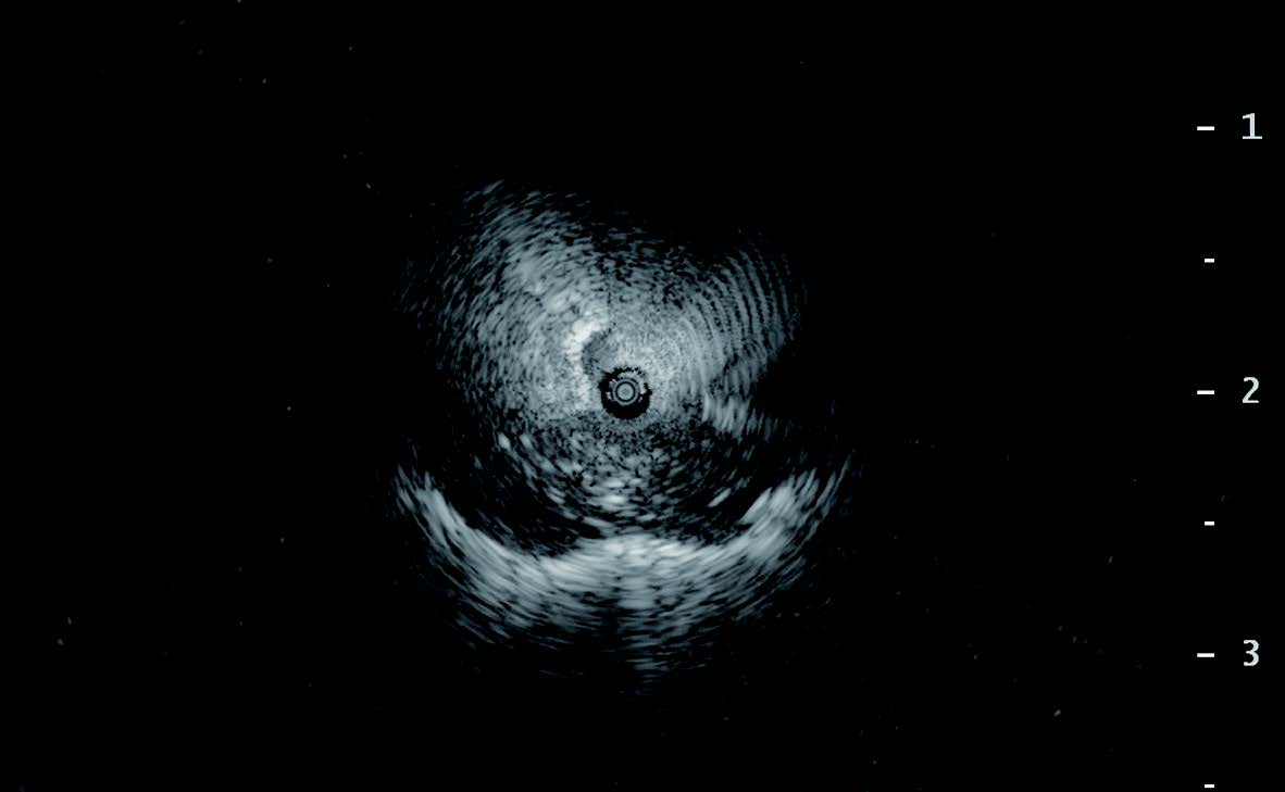 症例は左S3 aの結節であるが、明らかな関与気管支はなく、病変の前方上側に位置するB3 aiiの気管支が、もっとも病変に近い気管支であった(Figure 3)。BF-P290を使用し細径EBUS-GSを挿入したが、予想通りEBUS像がadjacent toであったため、EBUS-GS併用経気管支生検(EBUS-TBB)を4回施行した後に、留置したガイドシースにPeriView FLEXを挿入し、吸引針生検を2回行った(Figure 4)。X線透視で病変の中心に針があることが確認でき、その後のEBUSでwithinが得られたため、EBUS-TBBを3回追加できた(Figure 5)。本症例の最終診断は炎症性結節であった。
