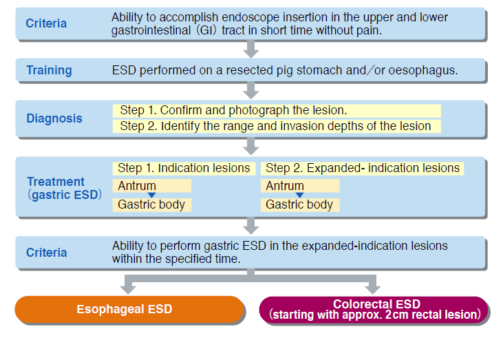Primeiramente, eles devem dominar as técnicas endoscópicas no TGI superior e as técnicas de inserção do endoscópio no TGI inferior. O endoscópio deve ser inserido em até 5 minutos sem causar dor. Além disso, a precisão na identificação do alcance da lesão e da profundidade de invasão é essencial. Como treinamento, os residentes praticam ESD uma ou duas vezes com órgãos suínos. Depois disso, eles começarão a realizar ESD clínico. Eles começam indicando lesão no antro e no corpo gástrico, e então gradualmente passam para lesões de maior amplitude no antro e no corpo gástrico. Quando o residente se torna capaz de remover essas lesões em 40 minutos, pode prosseguir para a ESD esofágica e colorretal.