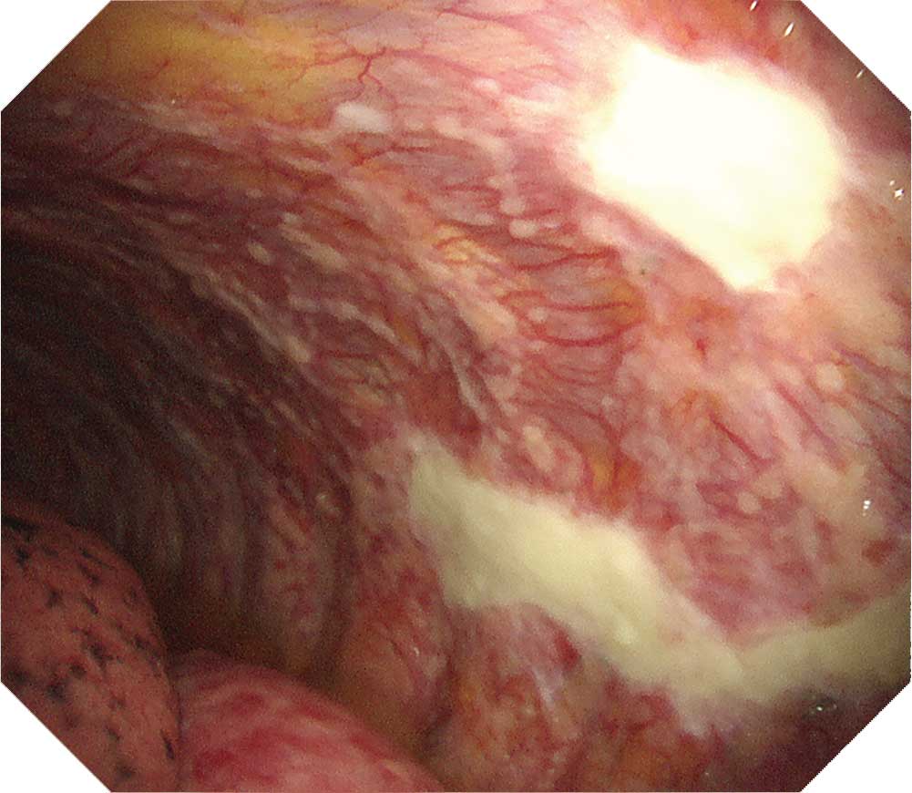 There is a multiple occurrence of granular lesions on the surface of the thickened pleura. In this NBI image, dilated vessels can be recognized in some parts; however, most parts are covered with white fibrous coating.Tip