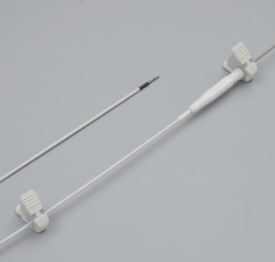 Insert the ultrasonic probe into the guide sheath’s accessory port so that the probe tip protrudes slightly from the guide sheath tip. Attach the US stopper to the ultrasonic probe by inserting the probe to the end of the slit.