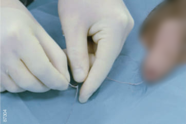 · Attach a #1 Ethibond™ type suture using a surgical knot to extend the retrieval suture.