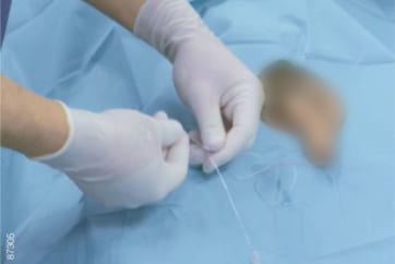 · Insert the catheter into the meatus while holding the retrieval suture taut.