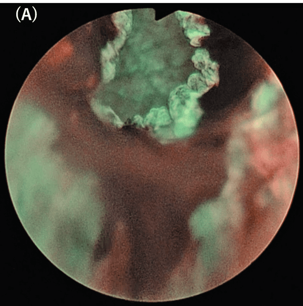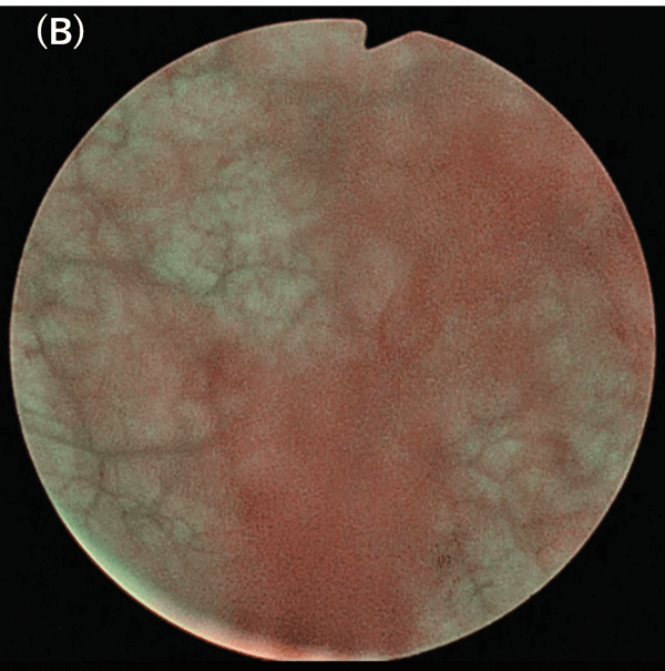 When there is a bleeding, the whole field of view becomes colored and unclear because NBI light bands are easily absorbed by hemoglobin (Fig. 6). Therefore, special attention is required during insertion of the cystoscope to avoid bleeding due to manipulation.
